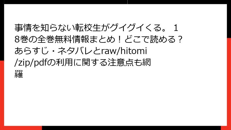 こんにちは、漫画愛好家のブロガーです! 人気ラブコメ『事情を知らない転校生がグイグイくる。』の18巻が話題沸騰中ですが、無料で読みたい一心でraw、hitomi、zip、pdf、漫画バンクなどの海賊版サイトに手を出していませんか? 残念ながら、そんなサイトは「タダほど怖いものはない」どころか、人生を台無しにするリスク満載なんです。今回は、法的・セキュリティ・経済的な観点から、具体的な被害事例を交えながら詳しく掘り下げます。ネタバレなしで安心して読んでくださいね。最終的に、正しい楽しみ方を提案しますよ!