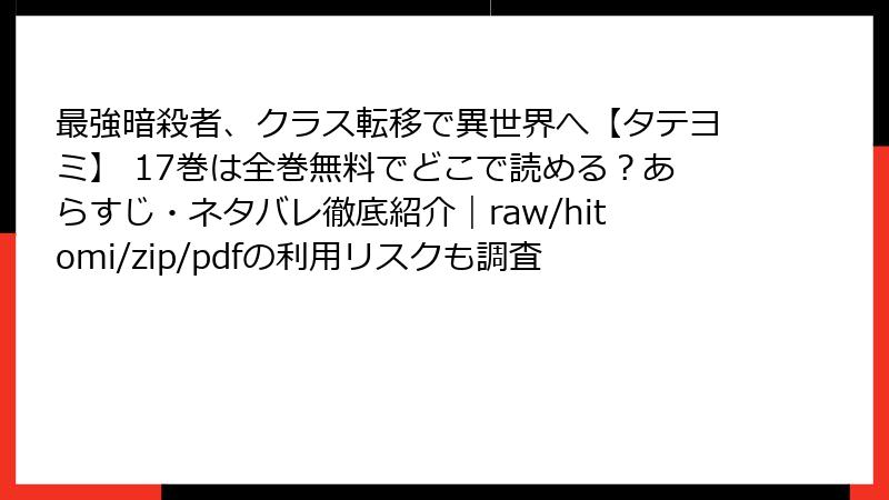 異世界転生ファンタジーの金字塔として人気を博す『最強暗殺者、クラス転移で異世界へ【タテヨミ】』。原作の雨宮和希氏によるストーリーが、akym氏のダイナミックな作画で縦読み形式で楽しめるこのコミカライズ版は、アクションの爽快さと暗殺者の心理描写が魅力です。今回取り上げるのは、2025年時点で最新に迫る17巻。シリーズの核心に迫る展開が続き、主人公ルーの成長と陰謀の渦がさらに深みを増しています。この巻では、勇者アベルドとの対決が本格化し、ルーの過去と未来が交錯するスリリングなエピソードが満載。ネタバレを最小限に抑えつつ、詳細なあらすじを章ごとに掘り下げてお届けします。読み応え抜群のボリュームをお楽しみください!
