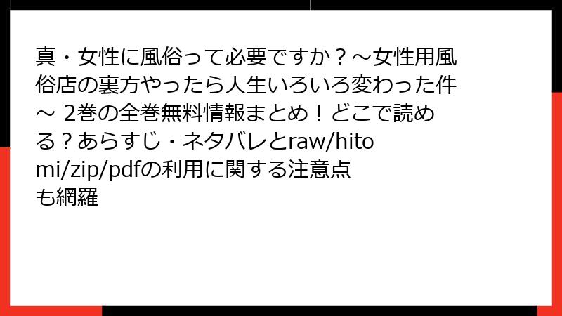 こんにちは、正規派漫画ブロガーのアキラです! ヤチナツ先生の傑作『真・女性に風俗って必要ですか?~女性用風俗店の裏方やったら人生いろいろ変わった件~』、めっちゃ面白いですよね? でも、「raw」「hitomi」「zip」「pdf」「漫画バンク」などの海賊版サイトで読もうとしているあなた! ちょっと待ってください! 無料に見えるその裏には、人生を破壊しかねない地獄のリスクが潜んでいます。今回は2巻のネタバレ級にガッツリ、海賊版利用の全リスクを暴露します。未読の方も、読んだ方も、必見です!