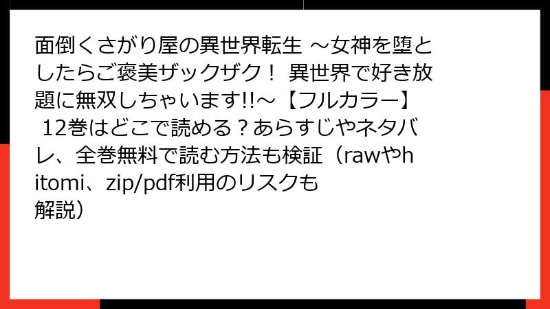 こんにちは、マンガファンの皆さん! 『面倒くさがり屋の異世界転生 ~女神を堕としたらご褒美ザックザク! 異世界で好き放題に無双しちゃいます!!~【フルカラー】』は、チート主人公の無双とハーレム展開が魅力の人気作品ですよね。このマンガを無料で読みたいと思う気持ち、わかります! でも、raw、hitomi、zip、pdf、漫画バンクなどの海賊版サイトを利用するのは、めっちゃ危険! 今回のブログ記事では、なぜ海賊版サイトでこのマンガを読むべきでないのか、そのリスクを詳しく解説します。単一の