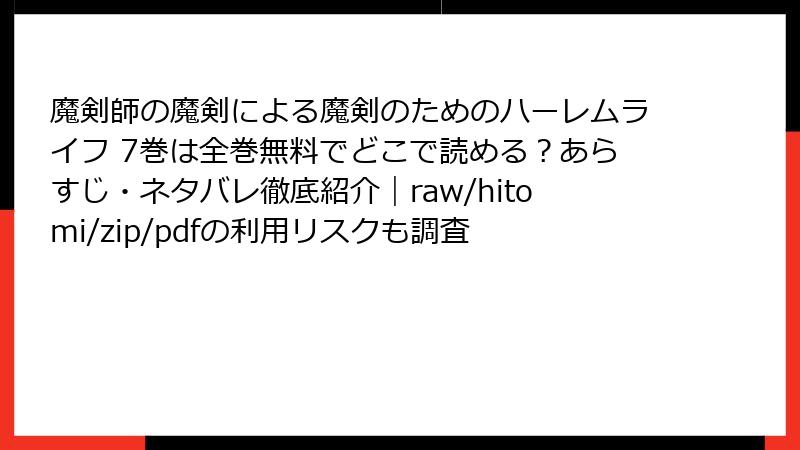 『魔剣師の魔剣による魔剣のためのハーレムライフ』のような魅力的な漫画を、海賊版サイトで読むリスクは法的罰則、セキュリティ被害、倫理的後悔のトリプルパンチ。2025年現在、被害事例が山積する中、一時的な便利さに負けず、正規ルートを選べば作者を支えつつ、安全に没入できます。raw/hitomi/zip/pdf/漫画バンクの誘惑に負けず、健全な読書ライフを! 皆さんの体験談やおすすめサービスをコメントでシェアしてください。次回は、正規アプリの深掘りレビューをお届けします。それでは、安全な漫画ワールドでお会いしましょう!