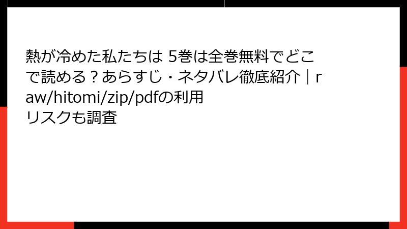 raw/hitomi/zip/pdf/漫画バンクなどの海賊版サイトは、法的罰則・ウイルス感染・経済損失・倫理的後悔の四重苦。『熱が冷めた私たちは』を心から楽しむなら、公式アプリ(例: ピッコマ、ebookjapan)で無料試し読みやセールを利用しましょう。月額数百円で数百作品が読め、クリエイターを応援できます。リスクを避け、クリーンな読書ライフを! あなたの体験談はコメントでどうぞ。次回は正規サービスの活用術をお届けします。