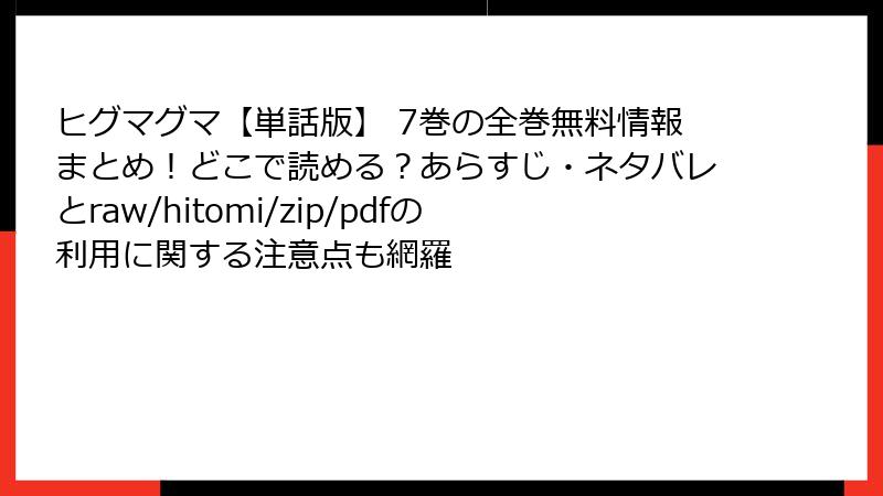リスクを避けつつ、漫画を満喫したいなら、正規サービス一択! 無料試し読みや割引キャンペーンが充実しており、海賊版の低品質とは格段の差。『ヒグマグマ【単話版】』は、公式電子書籍ストアで高解像度・広告なしで読めます。2025年現在、初回登録でポイント還元が主流で、7巻を半額以下でゲット可能。ウイルスゼロ、法的安心、業界支援の三拍子揃った選択です。