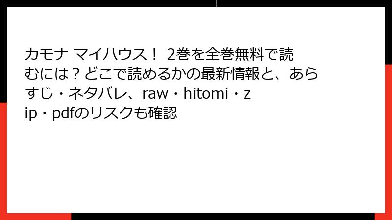南波あつこ先生の心揺さぶるラブストーリー『カモナ マイハウス!』。2巻の悶絶展開にハマって「今すぐ続きが読みたい!」と思う気持ち、めっちゃわかります。でも、raw、hitomi、zip、pdf、漫画バンクなどの海賊版サイトに手を出すのは、ちょっと待ってください! 無料で読める誘惑の裏には、法的・金銭的・精神的なリスクが山積み。ここでは、実際に起こりうるトラブルを具体例とともに徹底的に掘り下げます。安全に楽しむための知識、ぜひ身につけてください!