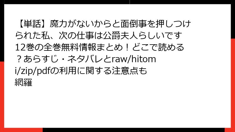 こんにちは、セキュリティ意識高い系ブロガーのあかりです! 今日は、皆さんが気軽にアクセスしがちな海賊版漫画サイト(raw、hitomi、zip、pdf、漫画バンクなど)で『魔力がないからと面倒事を押しつけられた私、次の仕事は公爵夫人らしいです』のような人気作品を読むことのリスクを、ガチで深掘りします。無料で読めるのは魅力的ですが、実は「タダほど怖いものはない」んです。法的トラブルから端末破壊まで、リアルな被害事例を基に解説。まだ利用を考えている方は、ここでブラウザを閉じて正規サービスに切り替えましょう! 以下、