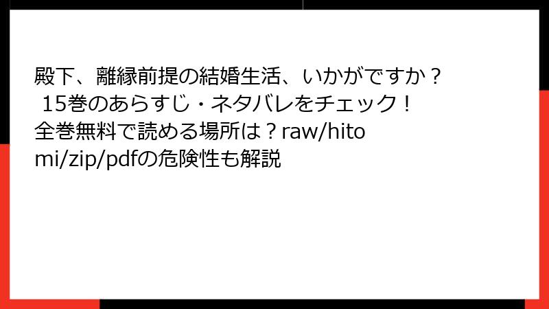 こんにちは! ファンタジーロマンスファン必見の安全読書ブロガーです。今日のテーマは、人気コミック『殿下、離縁前提の結婚生活、いかがですか?』をraw、hitomi、zip、pdf、漫画バンクなどの海賊版サイトで読むことのリスク。15巻まで出てるこの心温まる夫婦物語、無料で全巻アクセスできるのは魅力的ですよね。でも、2025年現在、これらのサイトは法的・セキュリティの地雷原。利用者の被害事例が急増中で、軽い気持ちで訪れると取り返しのつかない事態に…。この記事では、ブログ形式でリスクを多角的に深掘り。事例やデータを交え、読み応え満点でお届けします。結論から言うと、絶対避けて正規ルートを選ぼう! 作者の努力を尊重し、安全にハマりましょう。