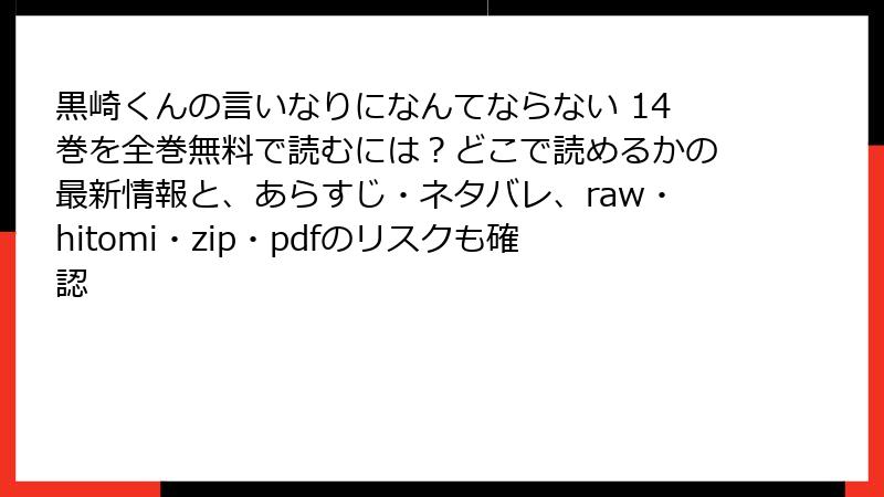 こんにちは、漫画ファン必見の安全読書ガイドブログへようこそ! ドキドキのラブコメ『黒崎くんの言いなりになんてならない』を、raw、hitomi、zip、pdf、漫画バンクなどの海賊版サイトで「無料で今すぐ読みたい!」と思う気持ち、めちゃくちゃわかりますよね。最新巻の夏祭りデートシーンに胸キュン必至です。でも、2025年現在、これらのサイトは一見の便利さとは裏腹に、法的・セキュリティ・経済的な地雷原。利用者の被害報告が急増中で、軽い好奇心でアクセスすると取り返しのつかない事態に陥る可能性大です。この記事では、そんな海賊版サイトのリスクを多角的に深掘り。ブログ形式で読みやすくまとめました。結論から言うと、絶対に避け、正規ルートで楽しむのが鉄則! 作者の黒崎くんのようなドSな魅力に負けない、賢いファンになりましょう♪