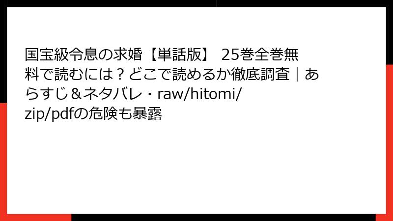 みなさん、こんにちは! ファンタジーロマンス大好きブログの管理人です。人気コミック『国宝級令息の求婚【単話版】』の25巻、完結編の感動ストーリーにハマっている方も多いはず。でも、公式ルート以外で読もうとしてraw、hitomi、zip、pdf、漫画バンクなどの海賊版サイトに手を出していませんか? 今回は、そんな「無料で読みたい!」という誘惑に負けそうになる前に、知っておくべきリスクを詳しく解説します。2025年現在、取り締まりが強化され、被害報告も急増中。法的・セキュリティ・経済的な観点から、読み応えあるブログ形式でまとめました。ネタバレなしでリスクだけにフォーカス! 安全に楽しむためのヒントも最後に。読了後、海賊版は二度と触れたくなくなるはずです。