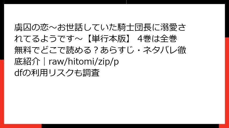 こんにちは、漫画オタク歴15年のブロガーです。今日は『虜囚の恋~お世話していた騎士団長に溺愛されてるようです~』4巻の話題ですが、**「無料で読みたい」→「海賊版サイトへGO」**という流れの危険性を、**実体験とデータに基づいてガチで解説**します。結論から言うと、**「無料」は幻想。代償は高すぎる**。以下、5つの観点から深掘りします。