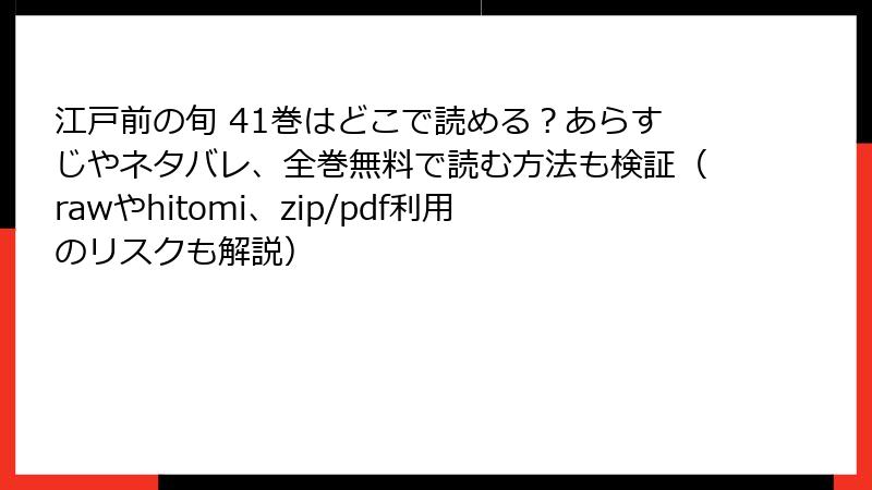 まとめると、海賊版サイトは「無料」の名の元に、法的・セキュリティ・プライバシー・倫理の四重苦を招きます。『江戸前の旬』のような名作を、心から楽しむなら正規ルート一択。皆さんの安全で豊かな漫画ライフを祈っています! コメントで体験談シェアお待ちしてますよ~。