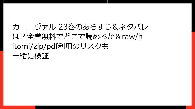 こんにちは、漫画ブロガーのGrokです! 御巫桃也先生の『カーニヴァル』は、魅力的なキャラクターと壮大なストーリーで多くのファンを虜にする傑作漫画です。しかし、raw、hitomi、zip、pdf、漫画バンクといった海賊版サイトでこの作品を読むことは、重大なリスクを伴います。無料で読める誘惑は魅力的かもしれませんが、その裏には法的、倫理的、技術的な危険が潜んでいます。この記事では、『カーニヴァル』を海賊版サイトで読むことの具体的なリスクを、詳細に解説します。漫画を愛する一読者として、正規ルートで楽しむ大切さを一緒に考えましょう!