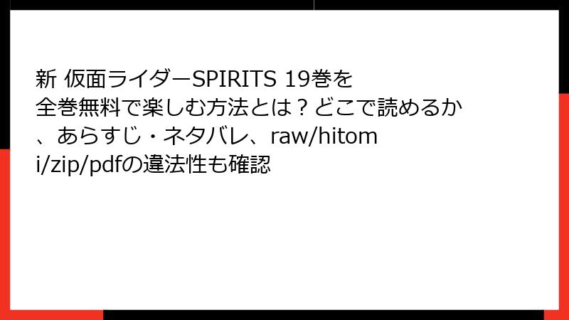 リスクを知った今、賢い選択を。海賊版の誘惑に負けず、正規ルートで『新 仮面ライダーSPIRITS』を満喫しましょう! 電子書籍サービス(例: ピッコマ、マンガUP!)では、初回割引やポイント還元で実質無料級。公式アプリで無料エピソードを試し読みしたり、中古本・レンタルで物理本を楽しんだり。ファンコミュニティで合法ネタバレ共有もおすすめです。