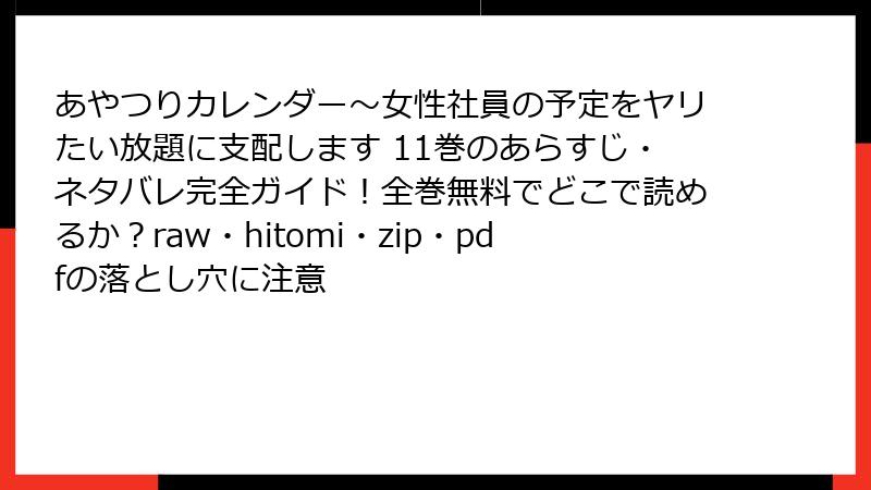 こんにちは、漫画ファンで安全読書を推進するブロガーです! 相川たつき先生の「あやつりカレンダー~女性社員の予定をヤリたい放題に支配します」みたいなエロティックで魅力的な作品を、無料で手に入れたい気持ち、めちゃくちゃわかりますよね。でも、raw、hitomi、zip/pdf、漫画バンク(やその後継サイト)などの海賊版サイトに手を出したら、大変なことになるかも…。2025年現在、これらのサイトは一見便利に見えますが、法的罰則からウイルス感染、個人情報漏洩まで、想像以上のリスクが潜んでいます。本記事では、そんな海賊版の闇を多角的に深掘り。ブログ形式で読みやすくまとめました。結論から言うと、絶対に避けて正規ルートを選びましょう! 作者の努力を無駄にせず、安全に楽しむための警鐘を鳴らします。