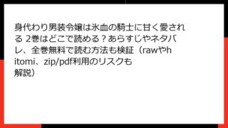 女性マンガ 身代わり男装令嬢は氷血の騎士に甘く愛される 2巻はどこで読める?あらすじやネタバレ、全巻無料で読む方法も検証(rawやhitomi、zip/pdf利用のリスクも解説) 身代わり男装令嬢は氷血の騎士に甘く愛される 2巻:偽りの騎士生活が織りなす甘い絆の深まり こんにちは、マンガ好きの皆さん! 今日は、女性向けラブファンタジーとして話題沸騰中の『身代わり男装令嬢は氷血の騎士に甘く愛される』第2巻のあらすじを、... 2025.09.21 女性マンガ身代わり男装令嬢は氷血の騎士に甘く愛される