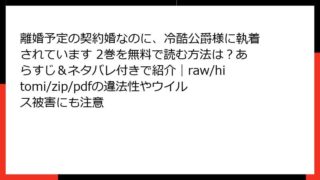 少女マンガ 離婚予定の契約婚なのに、冷酷公爵様に執着されています 2巻を無料で読む方法は?あらすじ&ネタバレ付きで紹介|raw/hitomi/zip/pdfの違法性やウイルス被害にも注意 離婚予定の契約婚なのに、冷酷公爵様に執着されています 2巻:契約の絆が揺らぐ甘い執着の物語 こんにちは、漫画好きの皆さん! 今日は、ファンタジーロマンスの魅力が詰まった人気作『離婚予定の契約婚なのに、冷酷公爵様に執着されています』第2巻の詳... 2025.09.23 少女マンガ離婚予定の契約婚なのに、冷酷公爵様に執着されています