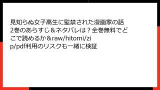少年マンガ 見知らぬ女子高生に監禁された漫画家の話 2巻のあらすじ&ネタバレは?全巻無料でどこで読めるか&raw/hitomi/zip/pdf利用のリスクも一緒に検証 見知らぬ女子高生に監禁された漫画家の話 2巻:奇妙な同棲が深まるサスペンスの渦中 こんにちは、漫画好きの皆さん! 今日は、Webで大反響を呼んだ監禁同棲ストーリー「見知らぬ女子高生に監禁された漫画家の話」の第2巻について、詳しくあらすじを掘... 2025.09.27 少年マンガ見知らぬ女子高生に監禁された漫画家の話