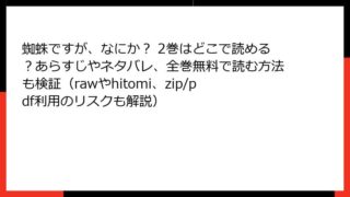 少年マンガ 蜘蛛ですが、なにか? 2巻はどこで読める?あらすじやネタバレ、全巻無料で読む方法も検証(rawやhitomi、zip/pdf利用のリスクも解説) 『蜘蛛ですが、なにか? 2巻』あらすじレビュー:蜘蛛のサバイバルがさらに過酷に! みなさん、こんにちは! 異世界転生ものの金字塔として今なお人気を博す『蜘蛛ですが、なにか?』。原作の馬場翁先生による小説を基に、かかし朝浩先生のコミカライズ版... 2025.10.11 少年マンガ蜘蛛ですが、なにか?