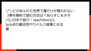 ゾンビのあふれた世界で俺だけが襲われない ゾンビのあふれた世界で俺だけが襲われない 3巻を無料で読む方法は?あらすじ&ネタバレ付きで紹介|raw/hitomi/zip/pdfの違法性やウイルス被害にも注意 ゾンビのあふれた世界で俺だけが襲われない 3巻:絶望の街で芽生える新たな絆と謎 ゾンビが世界を覆い尽くした終末の日本。普通のサラリーマン・武村雄介は、なぜかゾンビに一切襲われないという奇妙な体質を持っています。このユニークな設定が魅力の人気... 2025.10.14 ゾンビのあふれた世界で俺だけが襲われない青年マンガ