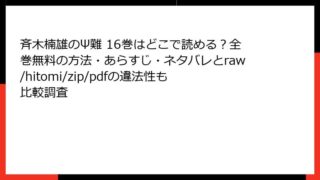 少年マンガ 斉木楠雄のΨ難 16巻はどこで読める?全巻無料の方法・あらすじ・ネタバレとraw/hitomi/zip/pdfの違法性も比較調査 斉木楠雄のΨ難 16巻:超能力者の日常が加速するハイライト満載の巻 こんにちは、マンガ好きのブロガーです! 今日は、麻生周一先生の傑作ギャグ漫画『斉木楠雄のΨ難』の16巻について、詳しくあらすじを掘り下げてお届けします。この作品は、超能力を... 2025.10.16 少年マンガ斉木楠雄のΨ難