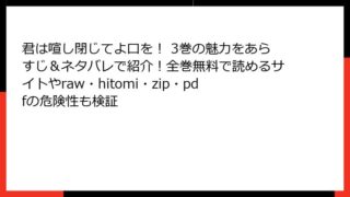 君は喧し閉じてよ口を! 君は喧し閉じてよ口を! 3巻の魅力をあらすじ&ネタバレで紹介!全巻無料で読めるサイトやraw・hitomi・zip・pdfの危険性も検証 君は喧し閉じてよ口を! 3巻 詳細あらすじレビュー:夏の輝きと心のつながり こんにちは、漫画好きのブロガーです! 今日は、森田俊平さん原作、アルデヒドさん作画によるハートフルラブコメディ『君は喧し閉じてよ口を!』の第3巻について、じっくりと... 2025.10.24 君は喧し閉じてよ口を!少年マンガ