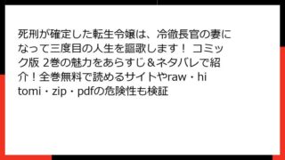 女性マンガ 死刑が確定した転生令嬢は、冷徹長官の妻になって三度目の人生を謳歌します! コミック版 2巻の魅力をあらすじ&ネタバレで紹介!全巻無料で読めるサイトやraw・hitomi・zip・pdfの危険性も検証 死刑が確定した転生令嬢は、冷徹長官の妻になって三度目の人生を謳歌します! コミック版 2巻の魅力あふれるあらすじ こんにちは、マンガ好きの皆さん! 今日は、乙女ゲーム風の転生ファンタジーが大好きな私から、注目のコミック版第2巻のレビューをお... 2025.10.30 女性マンガ死刑が確定した転生令嬢は、冷徹長官の妻になって三度目の人生を謳歌します! コミック版