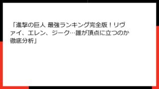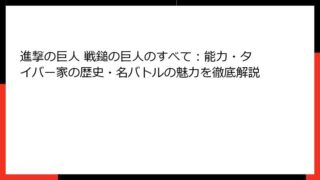 『進撃の巨人』時系列の鍵:物語の全貌を理解する 『進撃の巨人』は、その壮大な世界観と複雑なストーリー展開で、世界中のファンを魅了してきた作品です。 諫山創によるこの漫画は、単なるアクションや冒険にとどまらず、時間軸を巧みに操ることで、物語の...