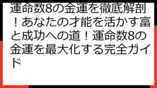 運命数8が掴む!金運爆上げ!富を築くための完全ガイド 運命数8をお持ちのあなたへ、このブログ記事へようこそ! あなたは、生まれ持ったリーダーシップと、大胆な行動力で、富を築くポテンシャルを秘めています。 しかし、その強さゆえに陥りやすい罠も...