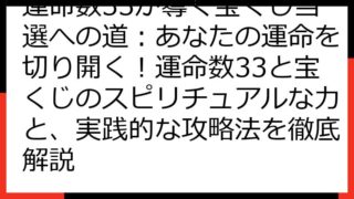【2025年版】運命数33が導く未来:スピリチュアルな使命と開運への道 2025年、運命数33を持つあなたにとって、どのような一年になるのでしょうか? このブログ記事では、運命数33の基本的な性質から、2025年の運勢、そして開運へのヒント...