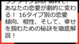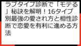 各タイプの恋愛傾向、強み、弱みを知り、自分自身のタイプや、気になる相手のタイプを深く理解しましょう。