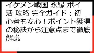 イケメン戦国 永縁 ポイ活徹底比較! おすすめポイントサイトと効率的な攻略法 イケメン戦国 永縁は、戦国武将との恋愛を楽しめる大人気の乙女ゲームです。 本記事では、イケメン戦国 永縁を対象としたポイ活(ポイントサイトを活用してポイントを稼ぐ...