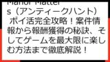ポイントサイトの比較、案件の探し方、ゲーム攻略のコツまで、ポイ活でManor Mattersを楽しむための情報が満載です。