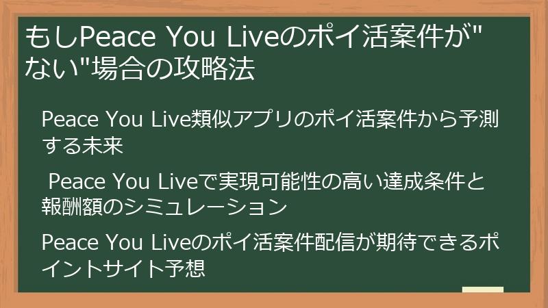 このセクションでは、類似アプリの案件から将来のPeace You Live案件を予測したり、実現可能性の高い条件と報酬額をシミュレーションするなど、案件がない状況でもポイ活を楽しむための戦略をご紹介します。