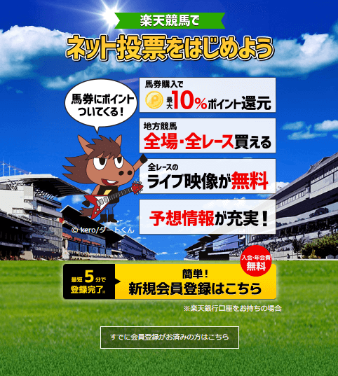 - キャンペーン内容:新規会員登録で、1,000円分の楽天競馬投票マネーと1,000楽天ポイントをプレゼント。